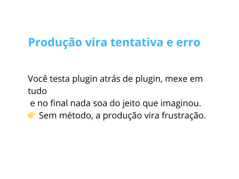 com isso, você passa a depender de:— Tutoriais aleatórios no YouTube— Presets de terceiros que nem sempre funcionam— O piniões conflitantes— E muita tentativa e erro